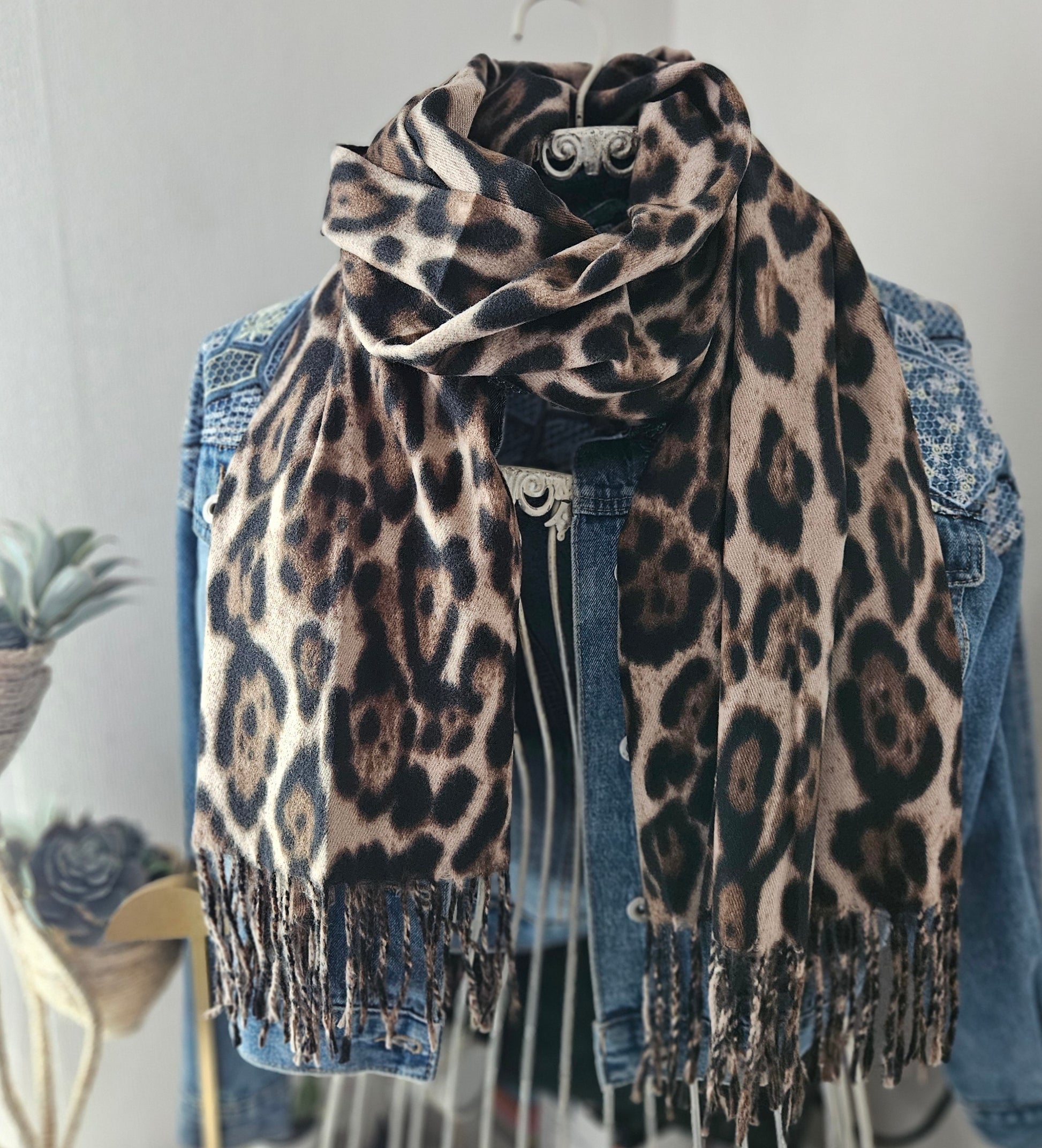 Écharpe extra longue taupe motif léopard