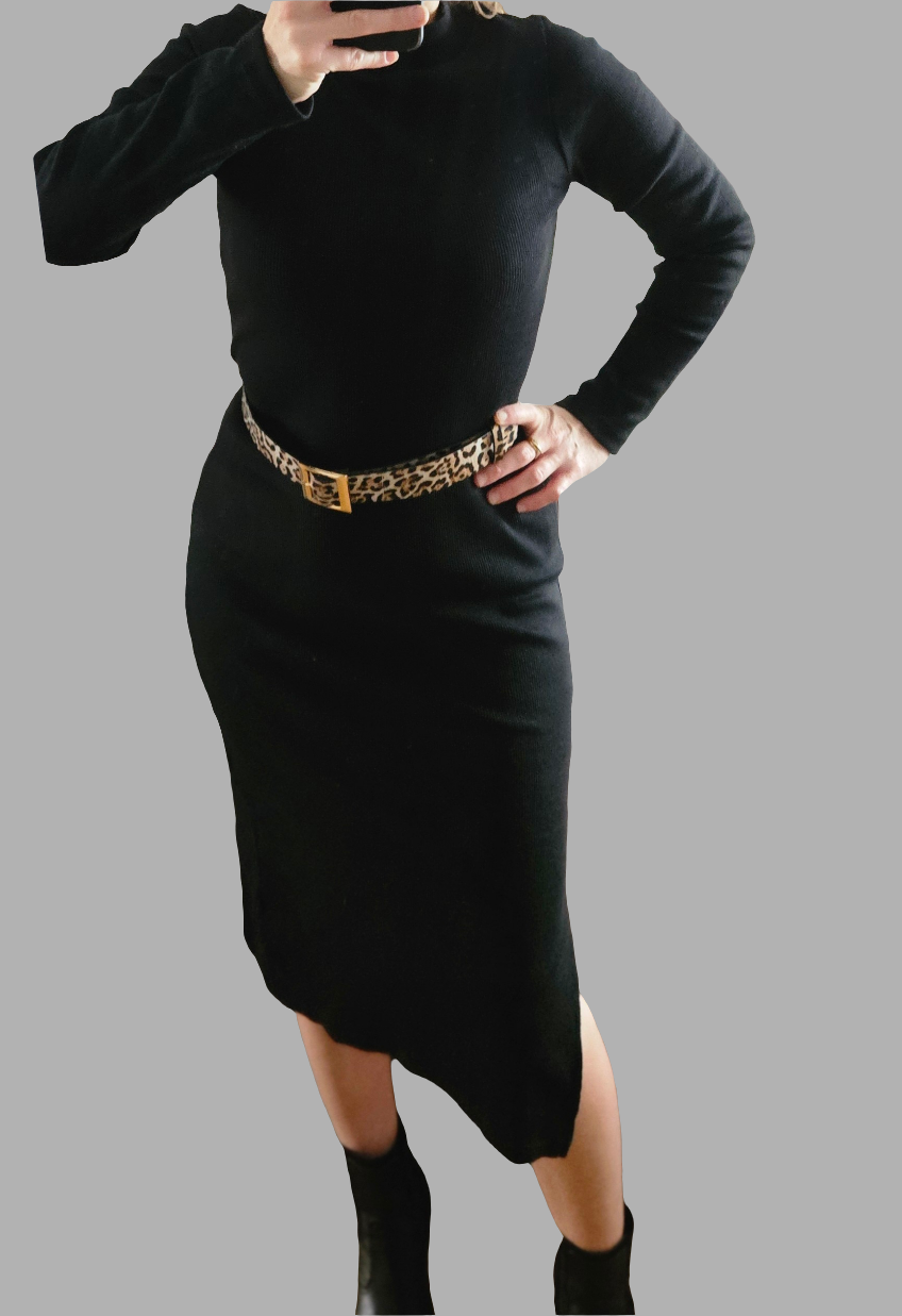 Robe mi longue en maille côtelé,de couleur noire Disponible en taille M ou L . Matière Extensible fente sur le côté.m, col rond. Matière:coton, polyester et elasthane.